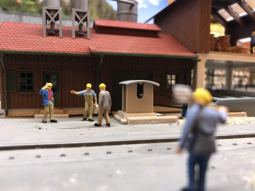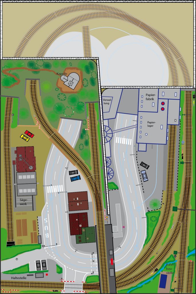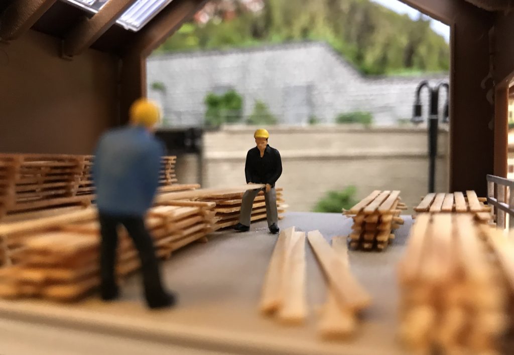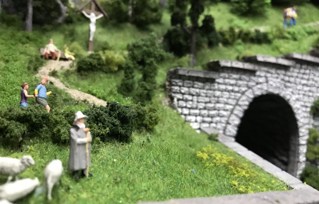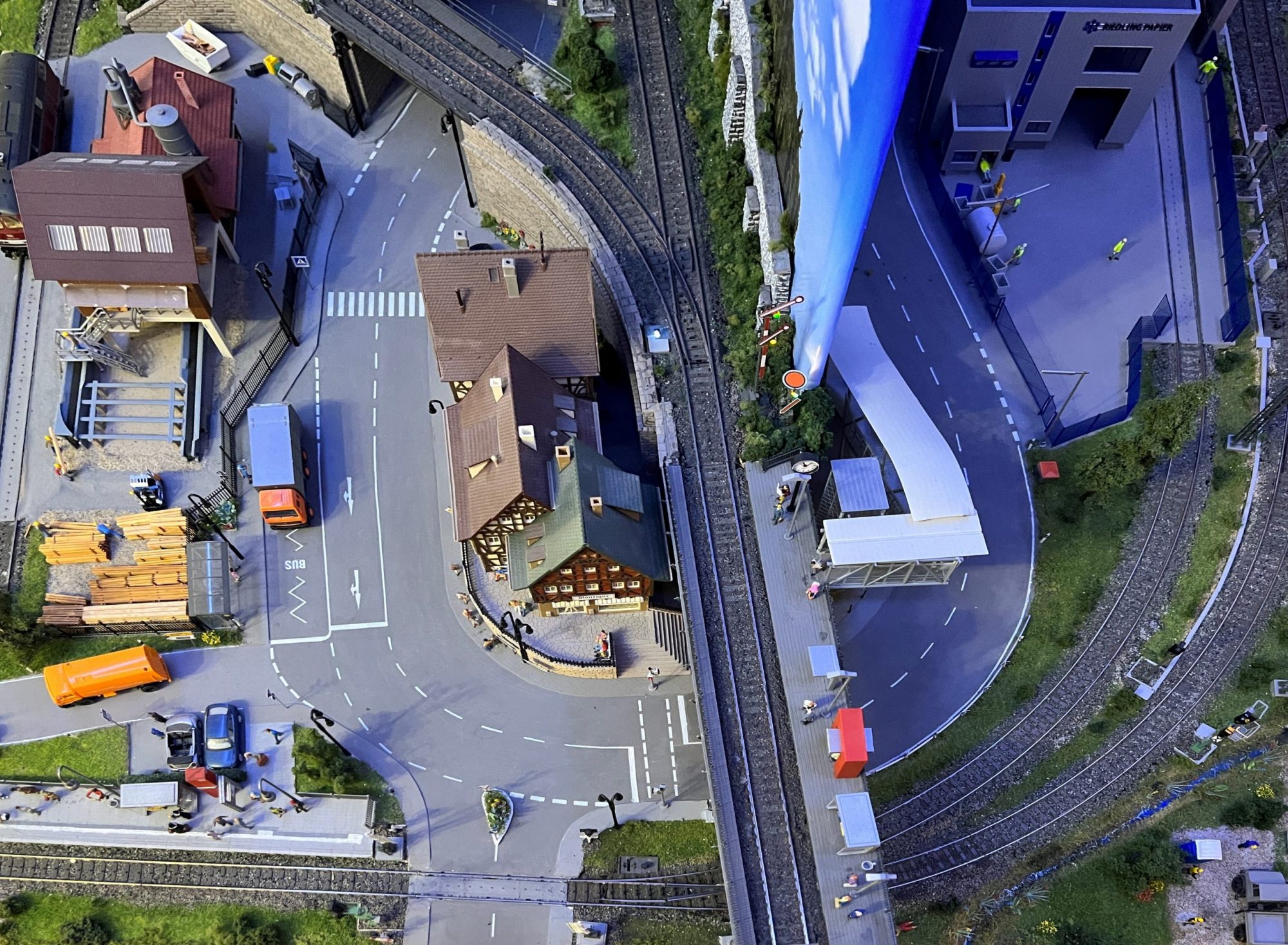 Themen sind auf diesem überschaubaren Raum von 1 x 1,5 m Berglandschaft mit Kapelle, Sägewerk, Bahnsteig, Gleisbaustelle, Papierfabrik, und einiges mehr.