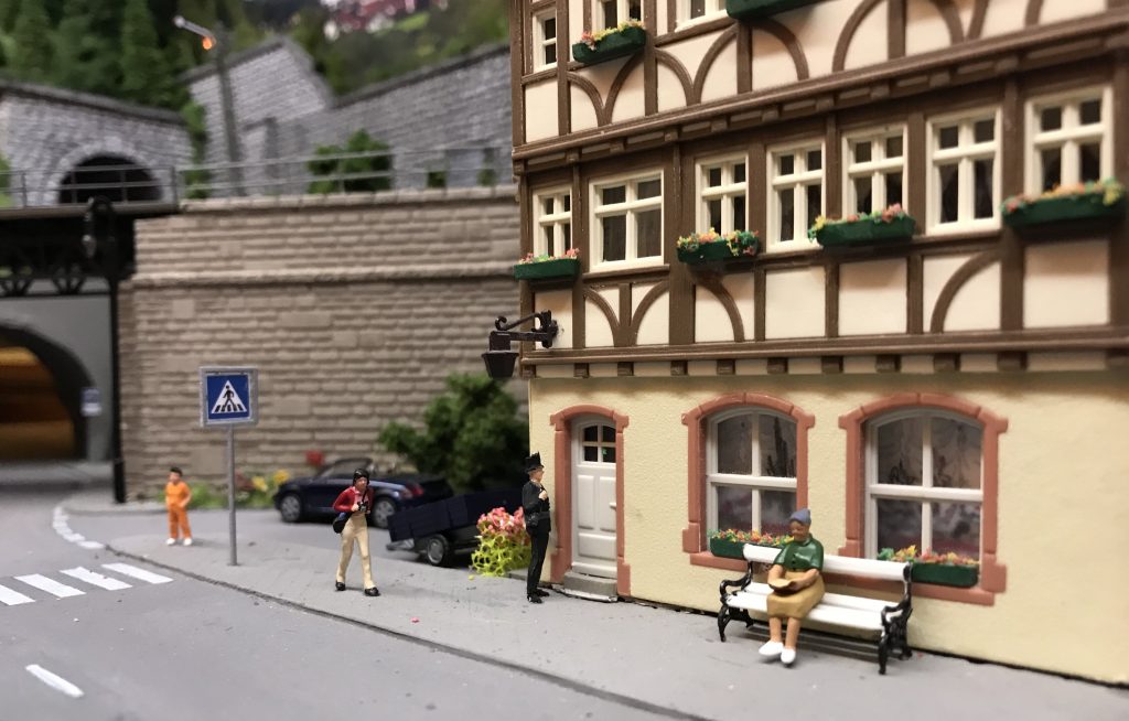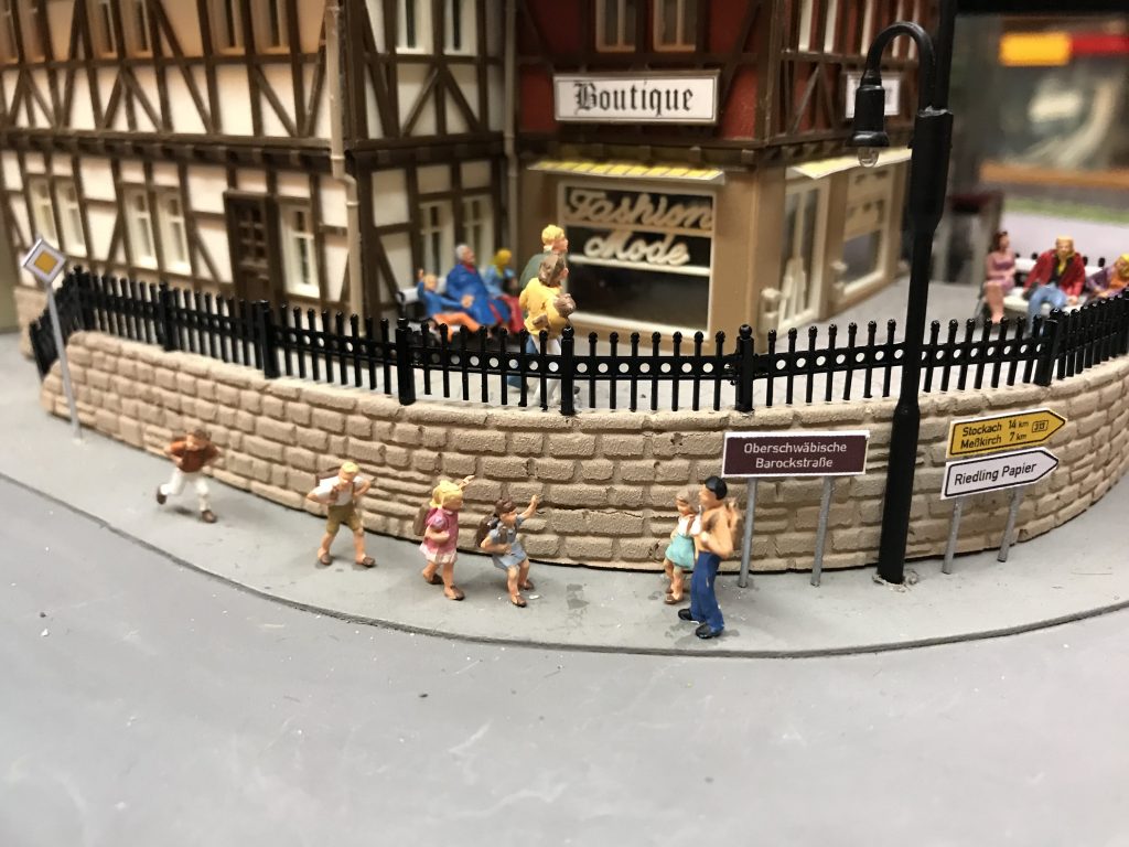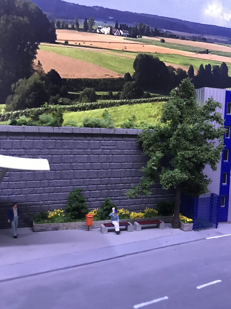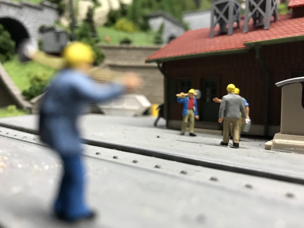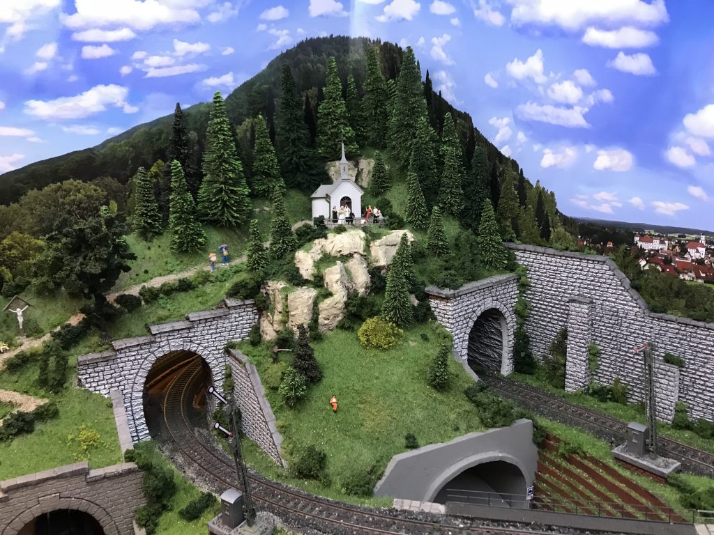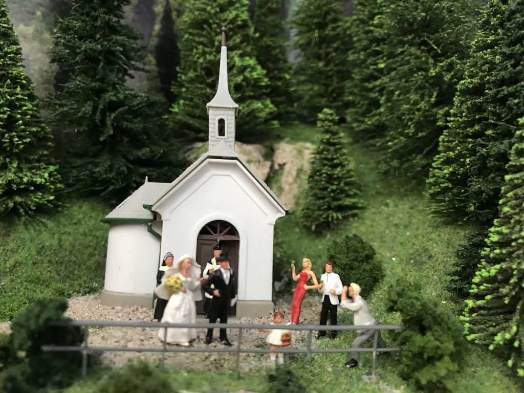 Themen sind auf diesem überschaubaren Raum von 1 x 1,5 m Berglandschaft mit Kapelle, Sägewerk, Bahnsteig, Gleisbaustelle, Papierfabrik, und einiges mehr.